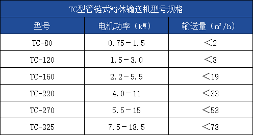 TC型管链式粉体输送机是输送粉状、小颗粒状及小块状等散状物料的连续输送设备,有水平、倾斜和垂直及Z字型等多种形式。在密闭管道内,粉体物料直线移动,直角转弯或Z型输送,通过不同形式组合,也可在三维空间方向输送。